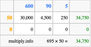 Below is an illustration showing you how to calculate 695 times 50 using the box method, using the instructions above.