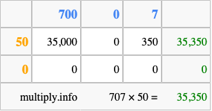 Below is an illustration showing you how to calculate 707 times 50 using the box method, using the instructions above.