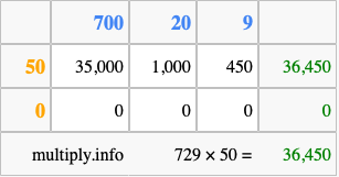 Below is an illustration showing you how to calculate 729 times 50 using the box method, using the instructions above.