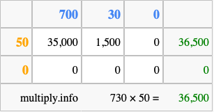 That's all there is to it! As you can see from the box above, the answer to 730 times 50 using the box method is 36,500.