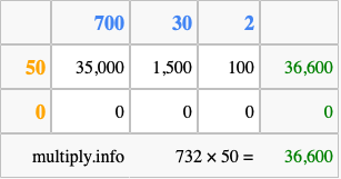 Below is an illustration showing you how to calculate 732 times 50 using the box method, using the instructions above.