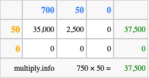Below is an illustration showing you how to calculate 750 times 50 using the box method, using the instructions above.