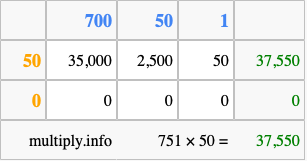 That's all there is to it! As you can see from the box above, the answer to 751 times 50 using the box method is 37,550.