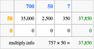 Below is an illustration showing you how to calculate 757 times 50 using the box method, using the instructions above.