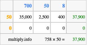 Below is an illustration showing you how to calculate 758 times 50 using the box method, using the instructions above.