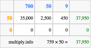 That's all there is to it! As you can see from the box above, the answer to 759 times 50 using the box method is 37,950.
