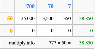 Below is an illustration showing you how to calculate 777 times 50 using the box method, using the instructions above.