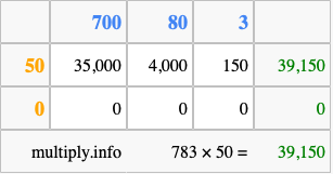 That's all there is to it! As you can see from the box above, the answer to 783 times 50 using the box method is 39,150.