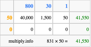 That's all there is to it! As you can see from the box above, the answer to 831 times 50 using the box method is 41,550.
