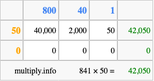 Below is an illustration showing you how to calculate 841 times 50 using the box method, using the instructions above.
