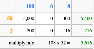 That's all there is to it! As you can see from the box above, the answer to 108 times 52 using the box method is 5,616.