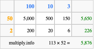 That's all there is to it! As you can see from the box above, the answer to 113 times 52 using the box method is 5,876.