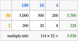 Below is an illustration showing you how to calculate 114 times 52 using the box method, using the instructions above.
