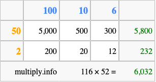 Below is an illustration showing you how to calculate 116 times 52 using the box method, using the instructions above.