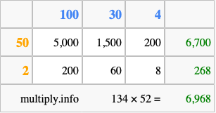 Finally, we add up all the sums we found in step 3 to get our final answer to 134 times 52.