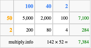 That's all there is to it! As you can see from the box above, the answer to 142 times 52 using the box method is 7,384.