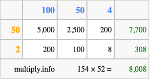 Below is an illustration showing you how to calculate 154 times 52 using the box method, using the instructions above.