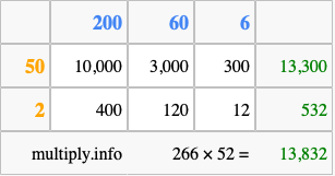 That's all there is to it! As you can see from the box above, the answer to 266 times 52 using the box method is 13,832.