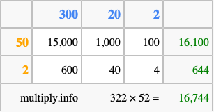 That's all there is to it! As you can see from the box above, the answer to 322 times 52 using the box method is 16,744.