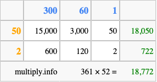 That's all there is to it! As you can see from the box above, the answer to 361 times 52 using the box method is 18,772.