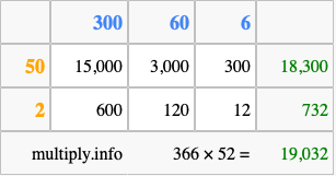 Below is an illustration showing you how to calculate 366 times 52 using the box method, using the instructions above.