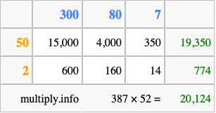 That's all there is to it! As you can see from the box above, the answer to 387 times 52 using the box method is 20,124.