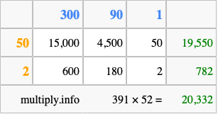 That's all there is to it! As you can see from the box above, the answer to 391 times 52 using the box method is 20,332.