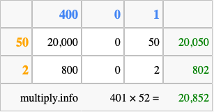 That's all there is to it! As you can see from the box above, the answer to 401 times 52 using the box method is 20,852.