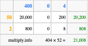 That's all there is to it! As you can see from the box above, the answer to 404 times 52 using the box method is 21,008.