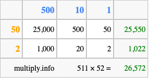 That's all there is to it! As you can see from the box above, the answer to 511 times 52 using the box method is 26,572.