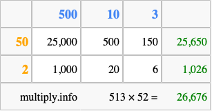 Below is an illustration showing you how to calculate 513 times 52 using the box method, using the instructions above.