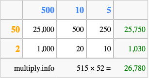 Below is an illustration showing you how to calculate 515 times 52 using the box method, using the instructions above.