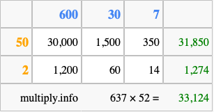 That's all there is to it! As you can see from the box above, the answer to 637 times 52 using the box method is 33,124.