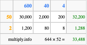 That's all there is to it! As you can see from the box above, the answer to 644 times 52 using the box method is 33,488.