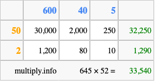 That's all there is to it! As you can see from the box above, the answer to 645 times 52 using the box method is 33,540.