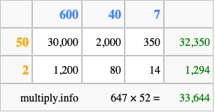That's all there is to it! As you can see from the box above, the answer to 647 times 52 using the box method is 33,644.