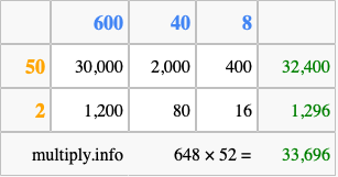 That's all there is to it! As you can see from the box above, the answer to 648 times 52 using the box method is 33,696.