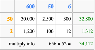 That's all there is to it! As you can see from the box above, the answer to 656 times 52 using the box method is 34,112.