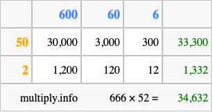 That's all there is to it! As you can see from the box above, the answer to 666 times 52 using the box method is 34,632.