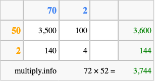 That's all there is to it! As you can see from the box above, the answer to 72 times 52 using the box method is 3,744.