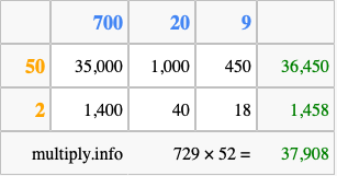 Below is an illustration showing you how to calculate 729 times 52 using the box method, using the instructions above.