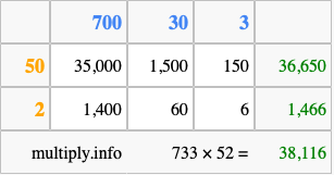 Finally, we add up all the sums we found in step 3 to get our final answer to 733 times 52.