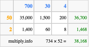 Finally, we add up all the sums we found in step 3 to get our final answer to 734 times 52.
