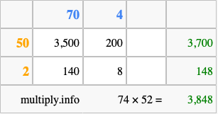 Below is an illustration showing you how to calculate 74 times 52 using the box method, using the instructions above.