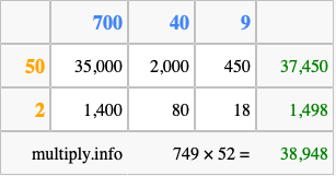 That's all there is to it! As you can see from the box above, the answer to 749 times 52 using the box method is 38,948.