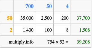 That's all there is to it! As you can see from the box above, the answer to 754 times 52 using the box method is 39,208.