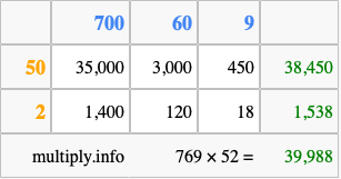 That's all there is to it! As you can see from the box above, the answer to 769 times 52 using the box method is 39,988.