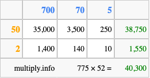 Below is an illustration showing you how to calculate 775 times 52 using the box method, using the instructions above.