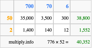 That's all there is to it! As you can see from the box above, the answer to 776 times 52 using the box method is 40,352.