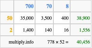 That's all there is to it! As you can see from the box above, the answer to 778 times 52 using the box method is 40,456.
